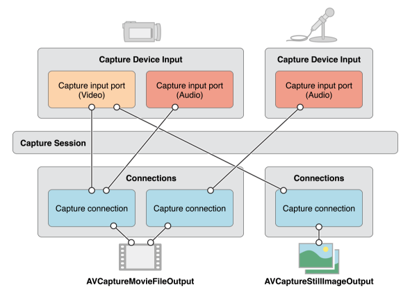 当你往一次录制 session 中添加一个输入或输出时,这个 session 会生成所有兼容的输入和输出端口间的连接,由AVCaptureConnection对象表示。